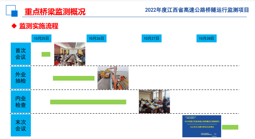公司领导对监测组一行的到来表示欢迎,对省厅长期以来对九江二桥的关心支持表示诚挚感谢。在监测工作见面上,监测组传达了省厅《2022年度全省高速公路桥隧运行监测实施方案》(以下简称“方案”)等文件要求。根据方案要求,此次监测将重点围绕“内业+外业”两大方面,综合评估九江二桥养护管理、技术状况,并结合桥梁管养、制度建立等工作进行逐项复核检查。