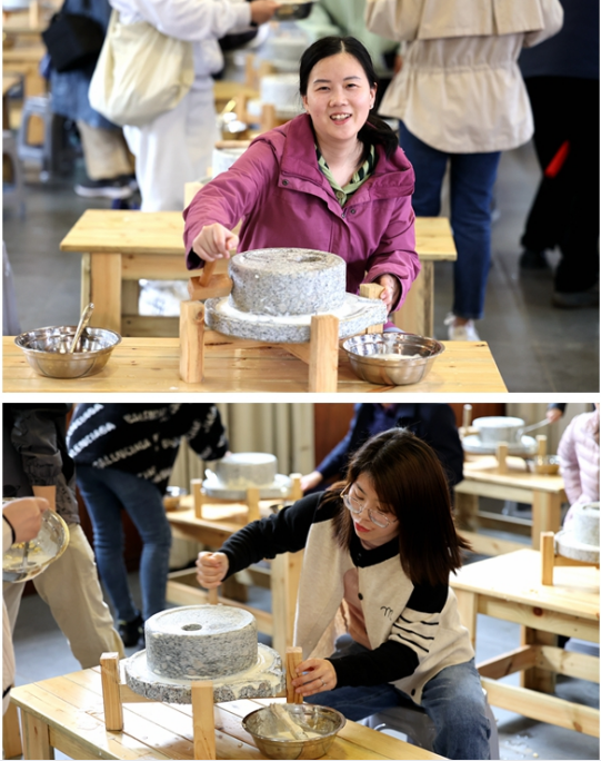 在手工体验课中,茶艺老师带领大家走进手工作坊,体验传统手工石磨制作豆腐的全过程。全体人员认真倾听讲解,随后两人一组分工合作,搭配进行倒黄豆和转磨盘两道工序。豆子慢慢地被磨成乳白色的液体,从旁边的凹槽引流到容器里。“石磨比想象中的重很多,推起来有些费力,好在我和同事轮番上阵,最终成功了”一名女职工兴奋的说道。