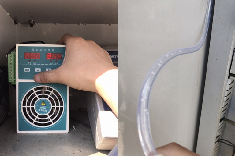 智能除湿装置采用半导体制冷除湿方式,自动将密闭空间的潮湿空气在风扇的作用下吸入除湿风道,空气中的水汽经过半导体制冷机构后冷凝成水,再通过导水管排出柜体,除湿效果显著,对收费车道计量称重设备起到保护作用。