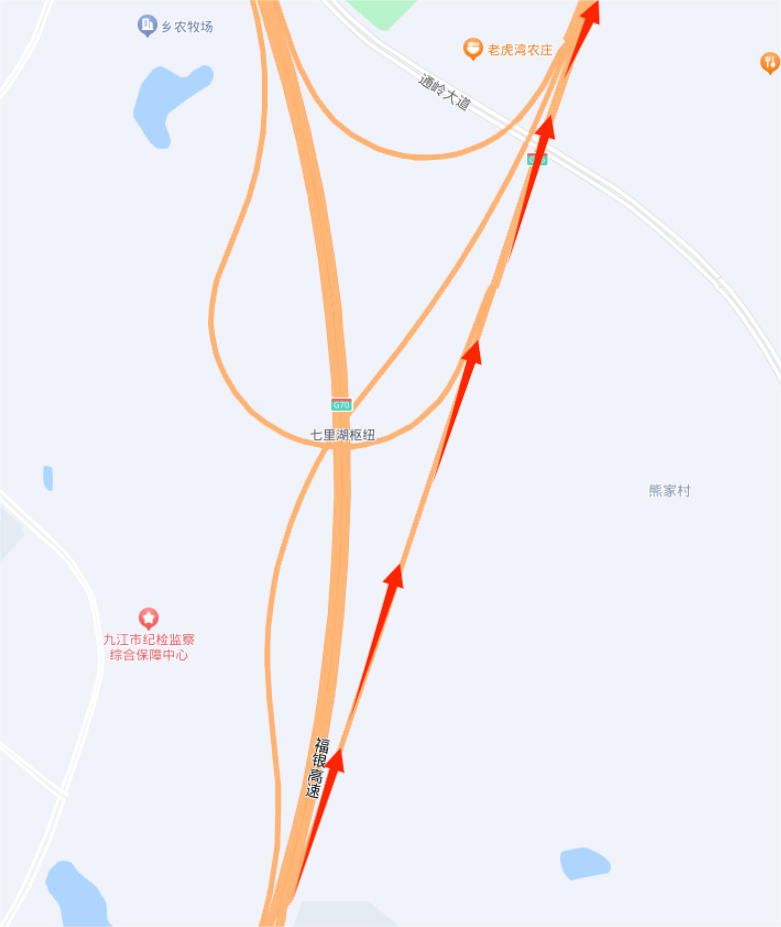 绕行方案2:七里湖枢纽九江城区方向→九江南收费站→途径市区绕行至经开区沙阎路