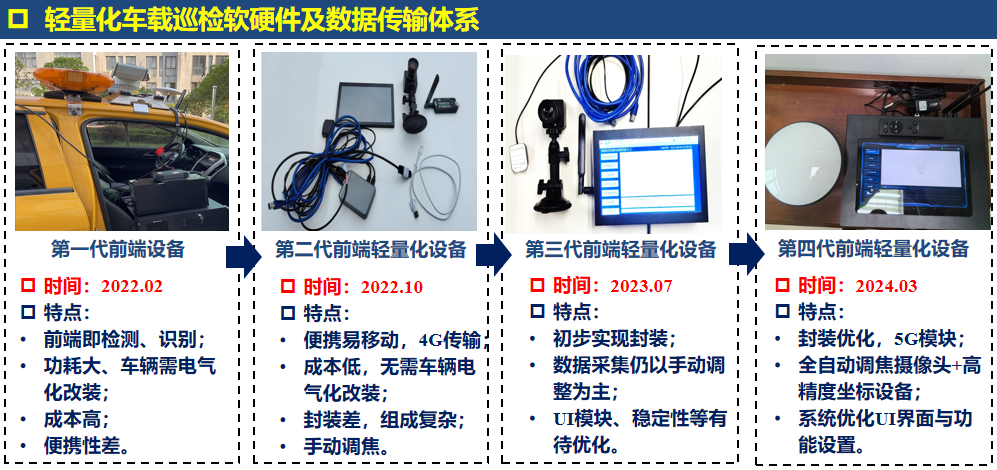 项目自立项研究至今,前后历经了四代前端检测设备的研发与优化,从最初需要电气化改装的车载设备,到轻量化手动采集,再到初步实现封装实用化设计,最终在现阶段实现全自动对焦数据采集与5G传输智能化巡检体系。
