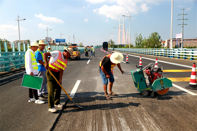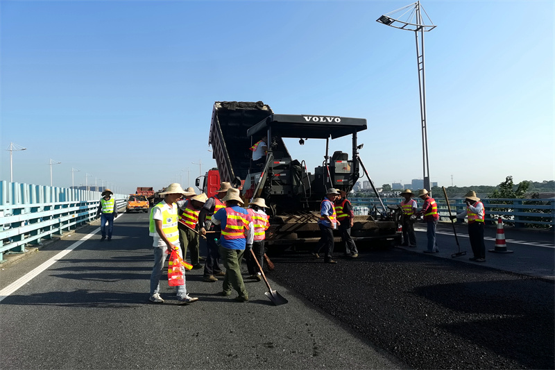 三伏天,在九江地区“蒸笼模式”下,桥面施工现场一片热火朝天,坑槽修补、路面铣刨、摊铺沥青等工程施工相继进场,路面检测、交安设施换新、路域环境治理、路网编号调整等工程项目有序开展。施工人员和管理人员在现场挥汗如雨,咬紧时间节点,保质保量完成国评各项目标任务。