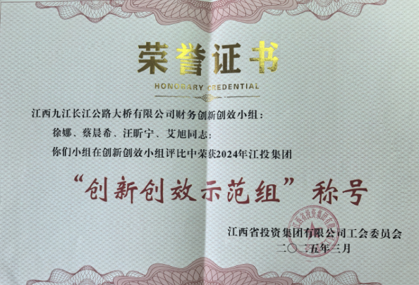 九江二桥财务创新创效小组荣获集团年度“创新创效示范组”称号