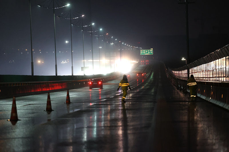 在调度中心,监控员每隔半小时通报一次桥面温度和车流通行情况;在抗冰雪现场,巡查人员每隔2小时开展一次全线巡察,查看路面结冰情况,融雪剂撒布车、除冰扫雪车根据冰情雪情开展全线扫雪和融雪剂撒布作业。截至目前,2022年春运抗冰除雪累计出动人力80余人次,巡查车、撒布车、扫雪车26台次,撒布环保型融雪剂20吨,使用安全锥桶3000余个。