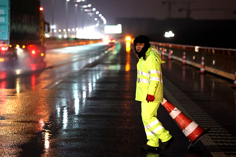 巡路人员风雪中整理沿线锥桶