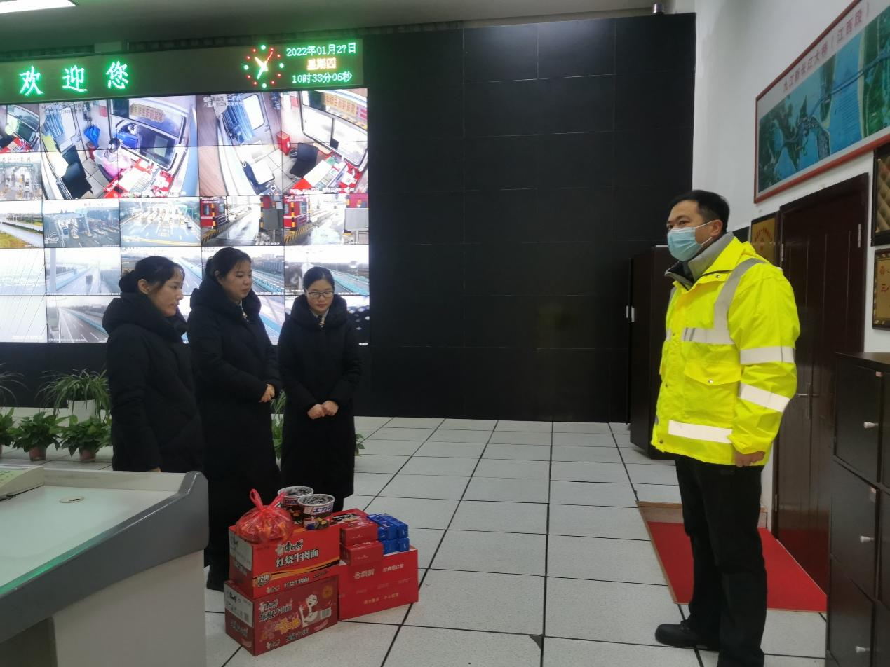 公司领导班子先后深入各部门、收费站、监控中心等地,为奋战在一线的广大干部职工送去了泡面、奶茶、咖啡等慰问品,对他们长期以来的辛勤付出表示了肯定,对他们持续为公司发展做出的奉献表示感谢。眼下正直春运,公司恰逢车流高峰和恶劣天气双重考验,每到一处,公司领导班子与干部职工亲切交谈,详细询问他们在疫情防控、春运保畅、后勤保障等方面的准备情况,临别时,还不忘叮嘱大家要注意个人安全:“要注意寒冬季节防寒保暖”“近期疫情防控形势严峻,上岗前一定要佩戴口罩手套”“横穿车道要牢记“一停二看三通过”通行原则”......每一句殷殷嘱咐,都满怀着公司领导班子对广大干部职工的真情流露和深情祝福。