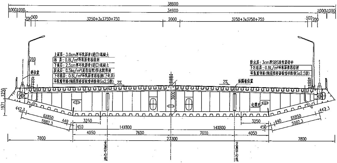 原钢桥面铺装层为上面层:2.5cm 厚环氧沥青(进口)混凝土+粘层:0.8L/m2 环氧沥青粘结剂+下面层:3.0cm 厚环氧沥青(进口)混凝土+防水层:0.5kg/m2(高粘结性)防水粘结剂+下封粘层:0.8L/m2环氧沥青粘结剂(下封层)+环氧富锌漆(钢箱梁板面喷砂除锈 Sa2.5 级)。